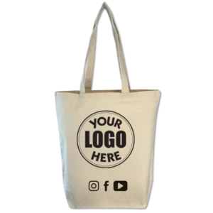 - Canvas tassen – 41 x 42 cm + 14 cm bodem, 310 grams stevig natuurlijk canvas, stijlvol, robuust en duurzaam. Bedrukking in je eigen ontwerp of logo maakt deze tas helemaal af.
