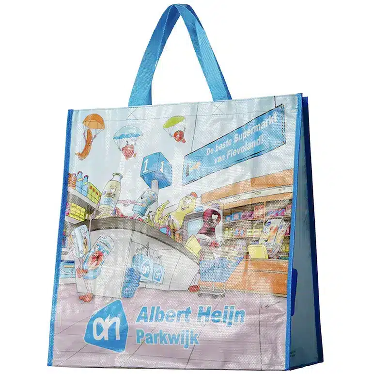 De bekende boodschappen shopper! Deze shoppers zijn oersterke duurzame tassen die lang meegaan. Onmisbaar voor supermarkten en andere food retail. Vraag vrijblijvend een offerte aan voor de bekende boodschappen shoppers op maat.