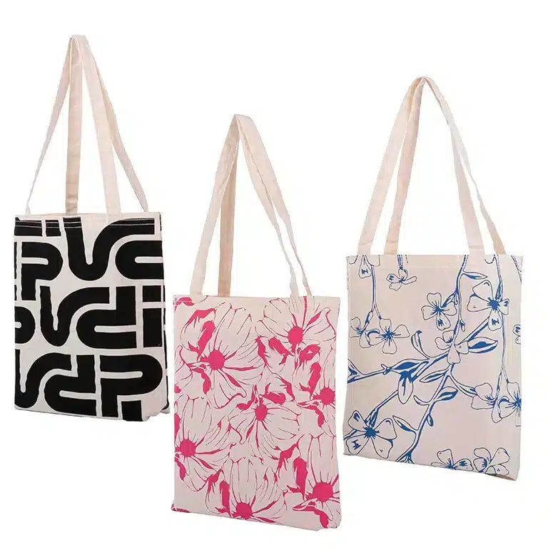 Canvas tassen zijn beschikbaar in een aantal populaire maten, al dan niet met bodemvouw en met grote lushandvatten.