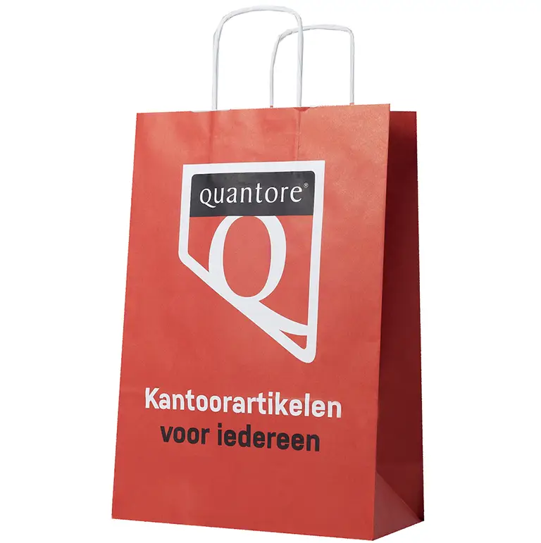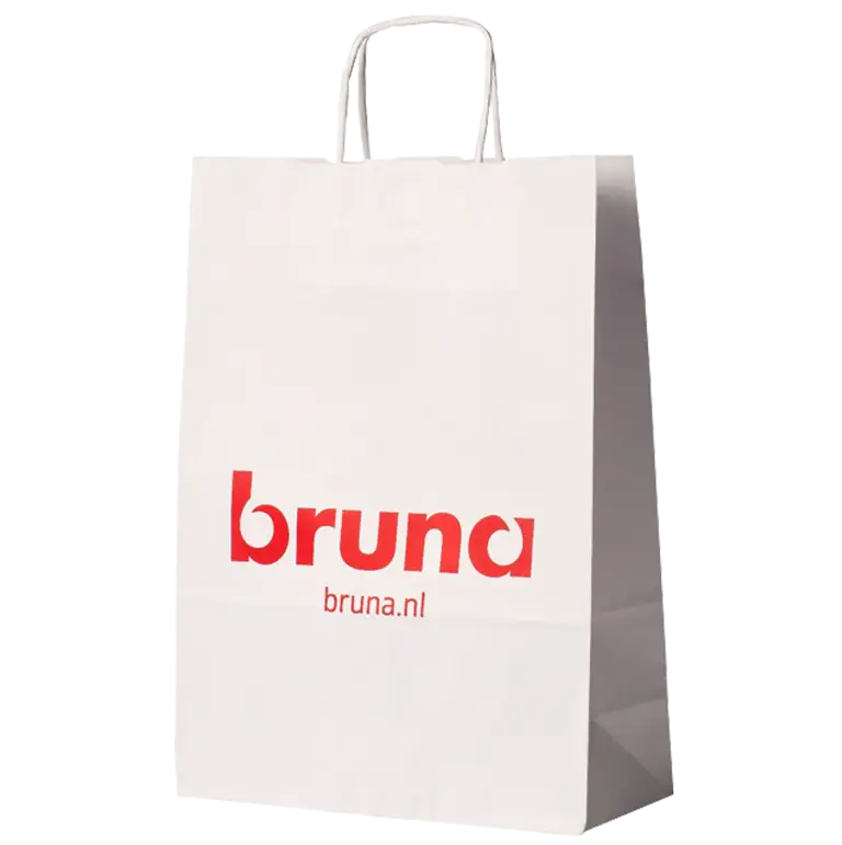 For small volumes, screen printing is the most economical printing technique for paper bags. Your design will be printed in max 6 PMS colors. The delivery time for screen printing is approximately two weeks. For larger runs from 3000 carrier bags, we print in full colour, with or without bleed, in flexo print. The delivery time for large print runs is around four weeks. Would you prefer unprinted paper bags with twisted handles? Let us know, we can help you.