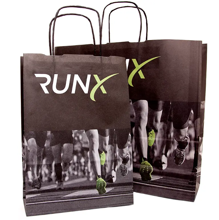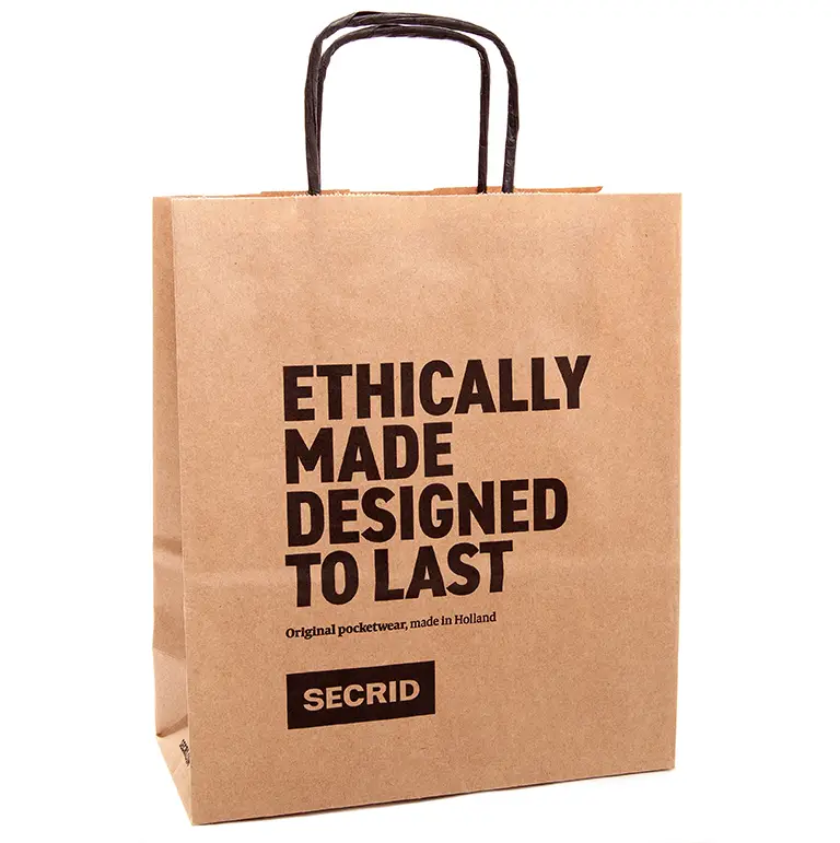 Paper Kraft bag with twisted paper handles. A commonly used paper bag among retailers. Available in various paper types, with or without a luxurious finish.
